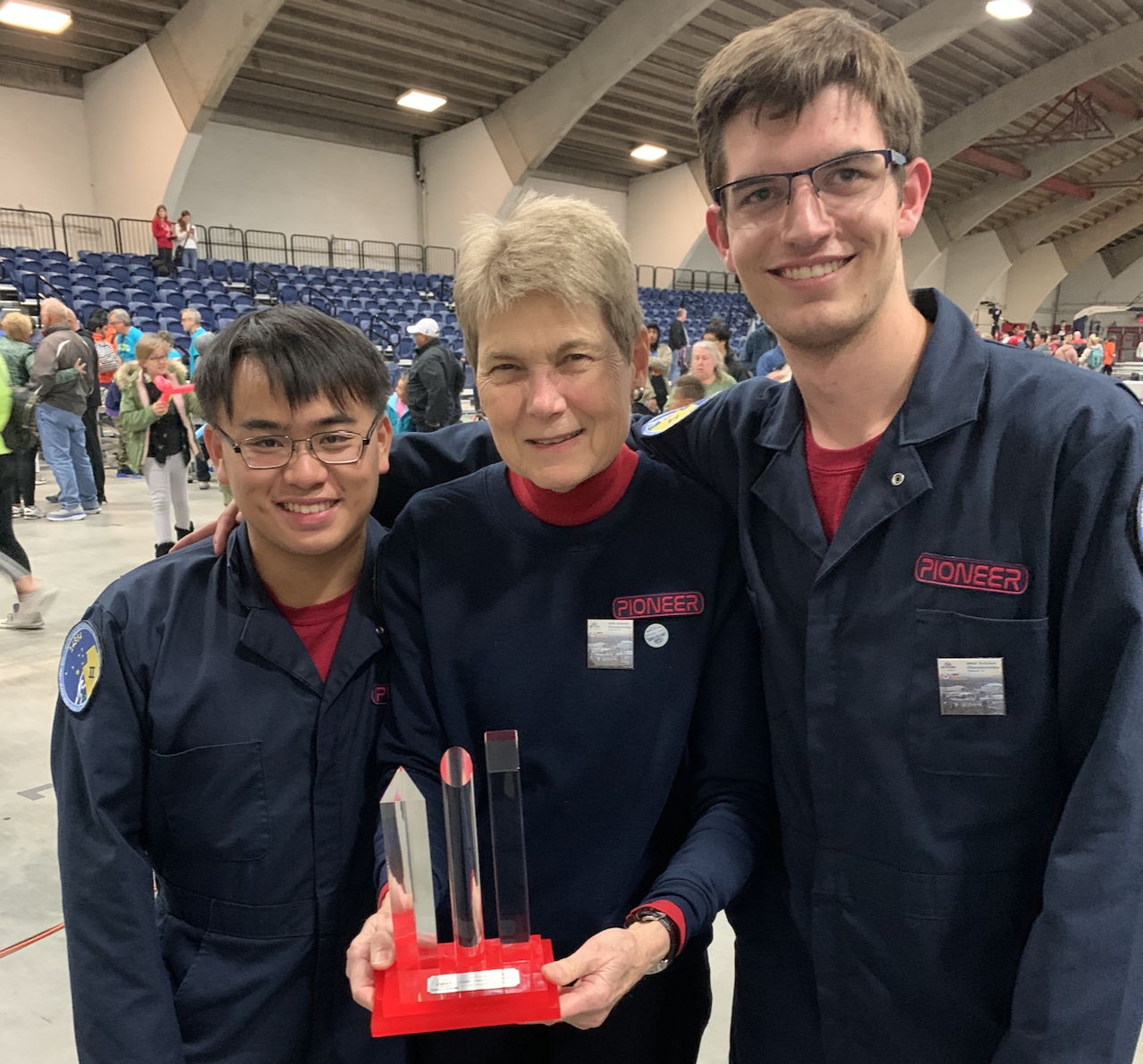 Pioneer coach Charlotte Ackerman was also recognized at the state championship (pictured above at the 2020 state championship), earning second place for the Compass Award out of more than 50 eligible coaches statewide. The Compass Award honors an outstanding mentor who inspires students and strengthens the FIRST community. Ackerman's students over the years say it best. Watch the nomination video created by team members led by Owen Cantor-Goldner (above).
